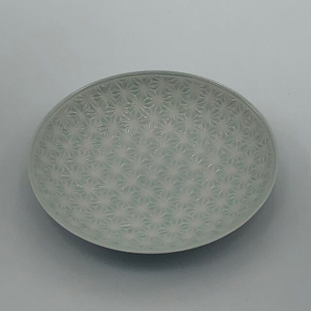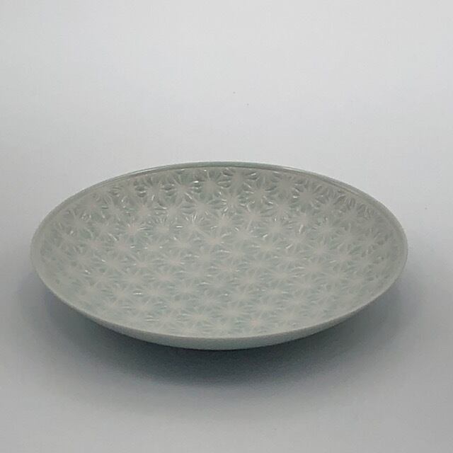 薄青磁がベースのお皿です。 産地 波佐見焼 材質 磁器 サイズ 直径21.5㎝×高さ3.5㎝ 電子レンジOK、食洗器OK ◆ご購入の前にABOUT(ショップ情報)もご確認お願いします。